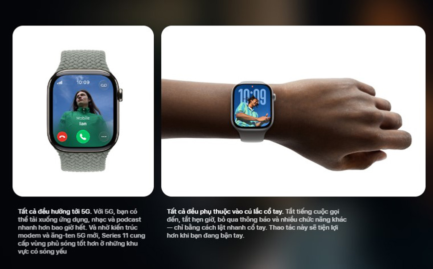 Phiên bản Apple Watch Series 11 GPS + Cellular mang đến khả năng hoạt động độc lập hoàn toàn như một chiếc điện thoại thu nhỏ. Người dùng có thể nghe gọi, nhắn tin, phát nhạc trực tuyến hoặc sử dụng bản đồ ngay cả khi không mang theo iPhone. Đáng chú ý, mẫu này được nâng cấp lên kết nối 5G, giúp tăng tốc độ truyền tải dữ liệu và mở rộng vùng phủ sóng, mang lại trải nghiệm ổn định và mượt mà hơn so với mạng LTE trước đây.