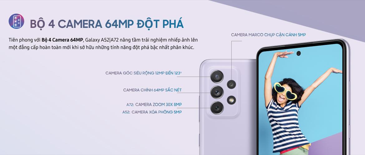 Một sự nâng cấp của Galaxy A52 chính là hệ thống camera sau với 4 ống kính có độ cảm biến 64MP-12MP-5MP-5MP hỗ trợ các chức năng chụp ảnh góc rộng, góc siêu rộng 123 độ với chất lượng ảnh chụp đạt độ phân giải cao vô cùng sắc nét.