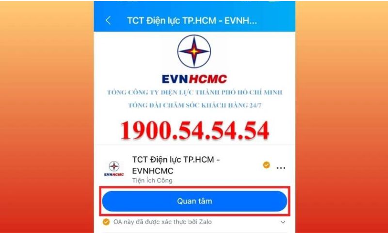 Bước 3: Sau khi màn hình xuất hiện Zalo của công ty Điện lực của khu vực bạn, bạn ấn chọn Quan tâm