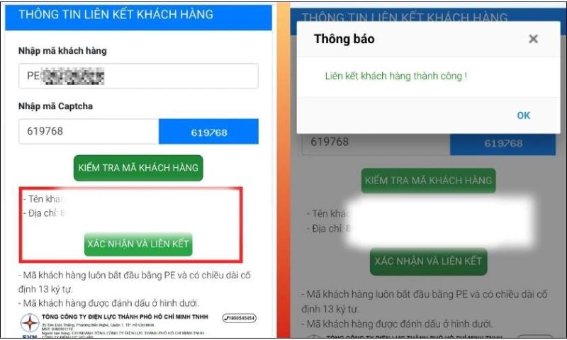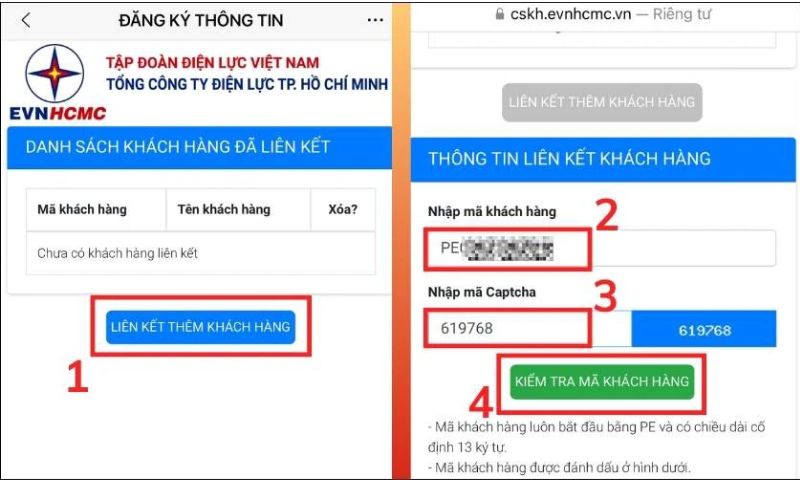 Bước 6: Tại phần Thông tin liên kết khách hàng. Bạn nhập chọn phần Mã khách hàng (Mã khách hàng bạn có thể tìm kiếm trên các hóa đơn tiền điện trước đó). Sau khi nhập hoàn tất, bạn ấn Kiểm tra mã khách hàng.