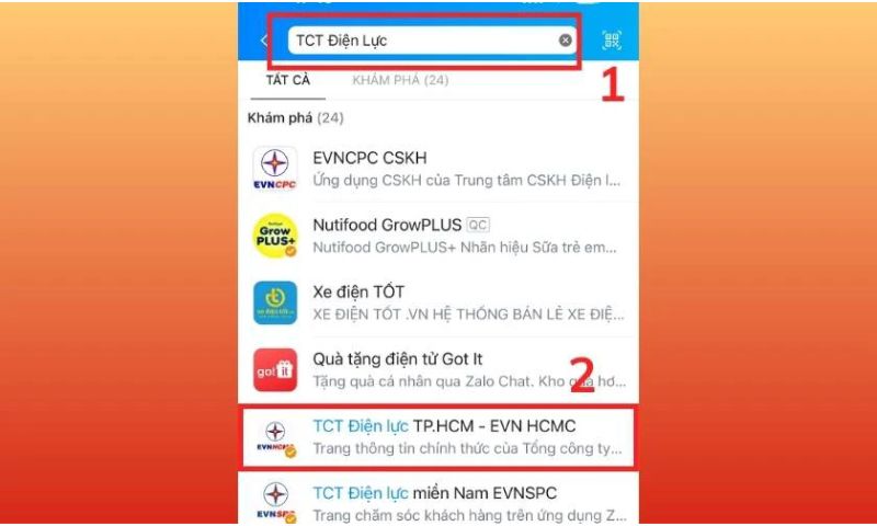 Bước 2: Trên thanh tìm kiếm, bạn nhập TCT điện lực như dưới đây. Sau đó bạn hãy chọn đúng tài khoản Zalo của công ty Điện lực tại khu vực bạn đang ở nhé!