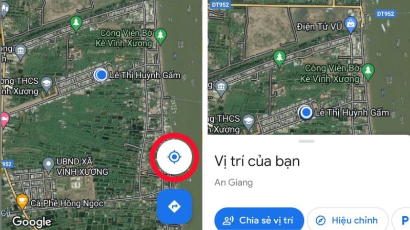 - Bước 3: Sau khi cho phép truy cập vị trí, Google Map sẽ hiển thị vị trí hiện tại của bạn trên bản đồ thông qua một biểu tượng đánh dấu hoặc một vùng màu xanh dương. Để hiển thị chi tiết hơn về địa hình xung quanh, bạn có thể nhấp vào biểu tượng định vị ở góc dưới bên phải của màn hình.