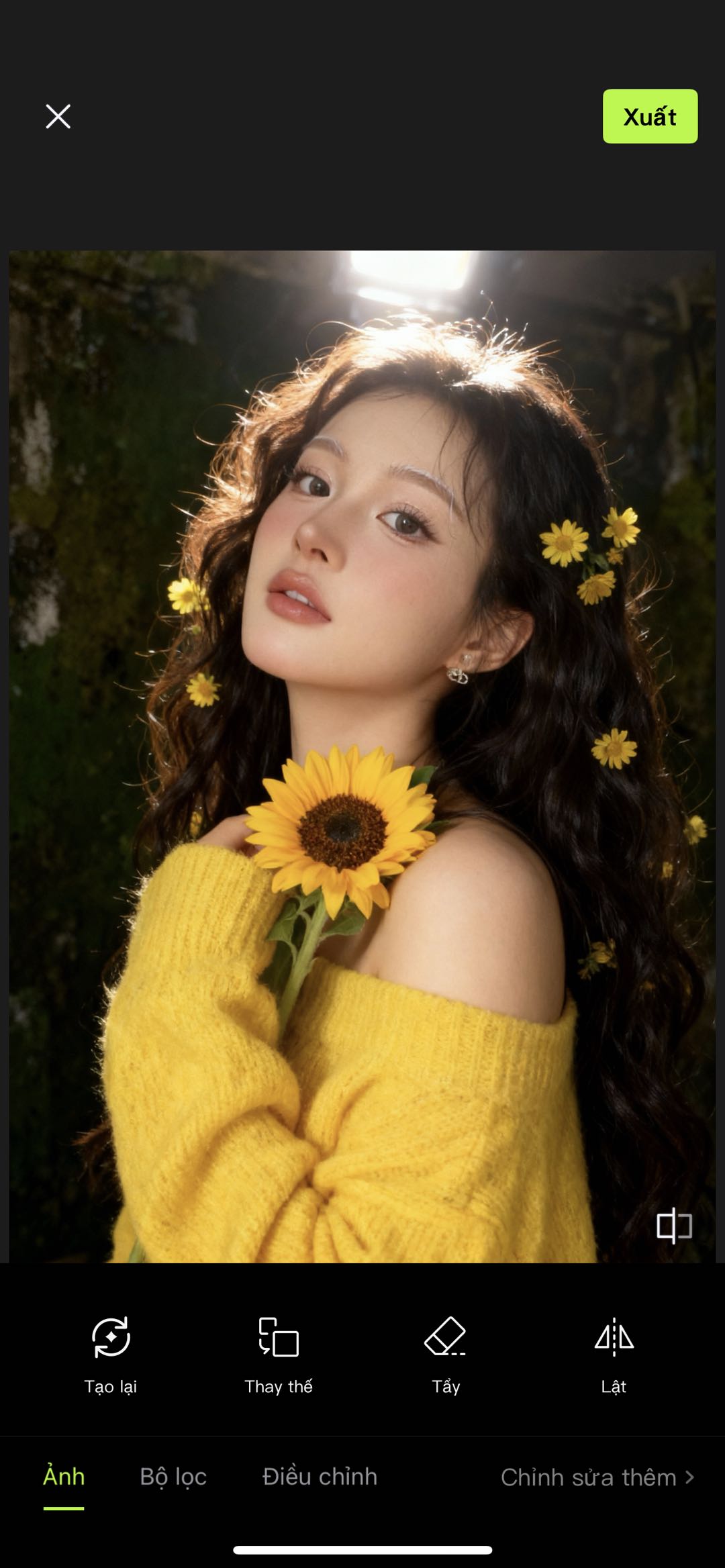 Chỉ mất chưa tới 1 phút là bạn đã có ngay một bức ảnh “hoa hướng dương” chuẩn vibe nàng thơ, ánh nắng vàng dịu và hiệu ứng lung linh như chụp studio.