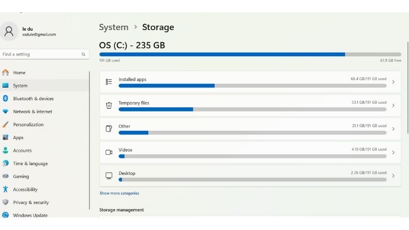 Nếu không gian trống rất ít hoặc đã hết, bạn cần thực hiện các bước tiếp theo để xử lý vấn đề. Để kiểm tra chi tiết dung lượng các file trong ổ C nhanh chóng, bạn có thể nhấn tổ hợp phím Windows + I > Settings > Chọn mục System > Storage và chọn phần bạn quan tâm. Chúng sẽ hiển thị dung lượng của từng file một cách chi tiết cho bạn.