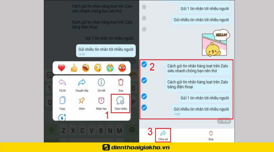 - Bước 1: Chọn hộp thoại chứa những tin nhắn mà bạn muốn chia sẻ -> Nhấn và giữ một tin nhắn bất kỳ -> Nhấn nút Chọn nhiều -> Sau đó nhấn chọn những tin nhắn bạn muốn gửi -> Ấn chọn Chia sẻ