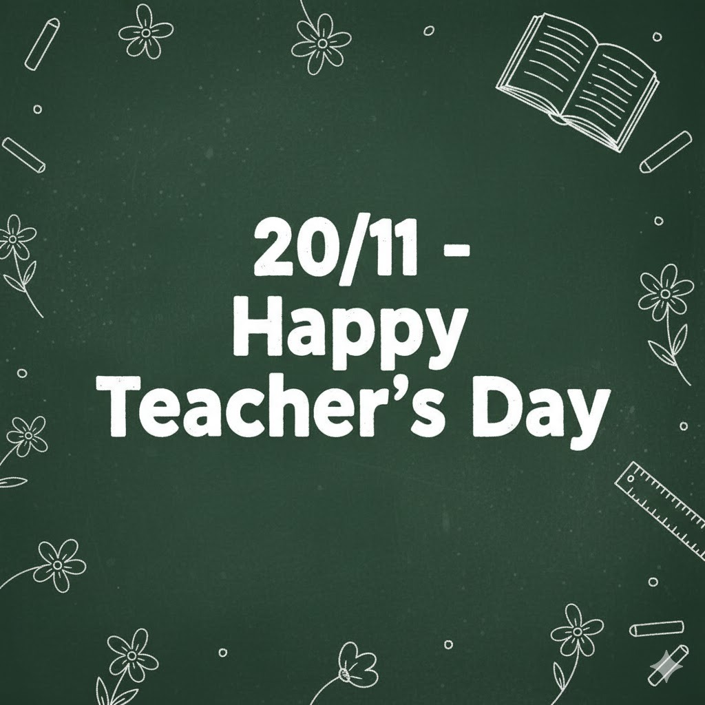 Chalkboard-style 20/11 greeting card background, dark green board texture with light chalk dust effect. White chalk lettering centered: “20/11 – Happy Teacher’s Day”s of chalk, ruler, book and flowers, nostalgic classroom feeling.
