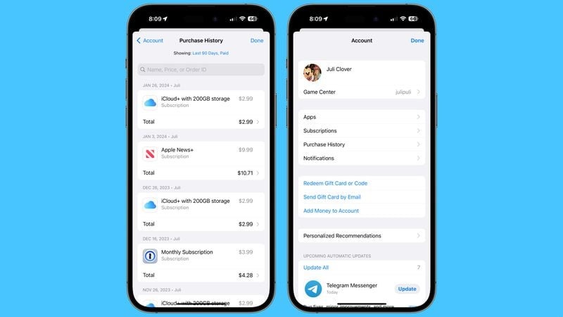 Tính năng Mua hàng trên App Store hiện hiển thị lịch sử mua hàng trên toàn tài khoản cho Apple ID. Nó bao gồm mua TV và phim, mua nhạc, đăng ký và mua ứng dụng, đồng thời có cùng giao diện khi truy cập thông tin mua hàng cho bất kỳ “ID Apple” nào.