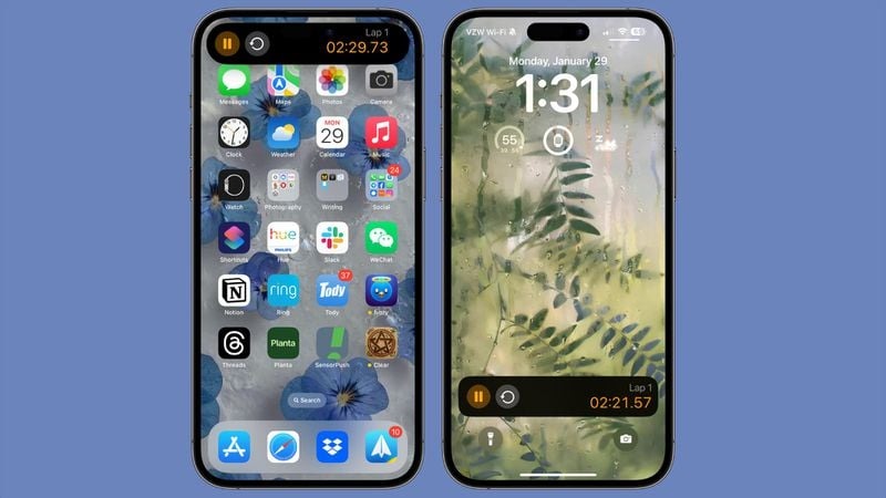 iOS 17.4 bổ sung chức năng Hoạt động trực tiếp cho tính năng Đồng hồ bấm giờ. Khi kích hoạt, bạn có thể theo dõi thời gian bấm giờ trực tiếp trên Đảo động và Màn hình khóa. Các nút điều khiển tiện lợi giúp bạn tạm dừng, xóa hoặc bắt đầu vòng đua mới một cách dễ dàng.