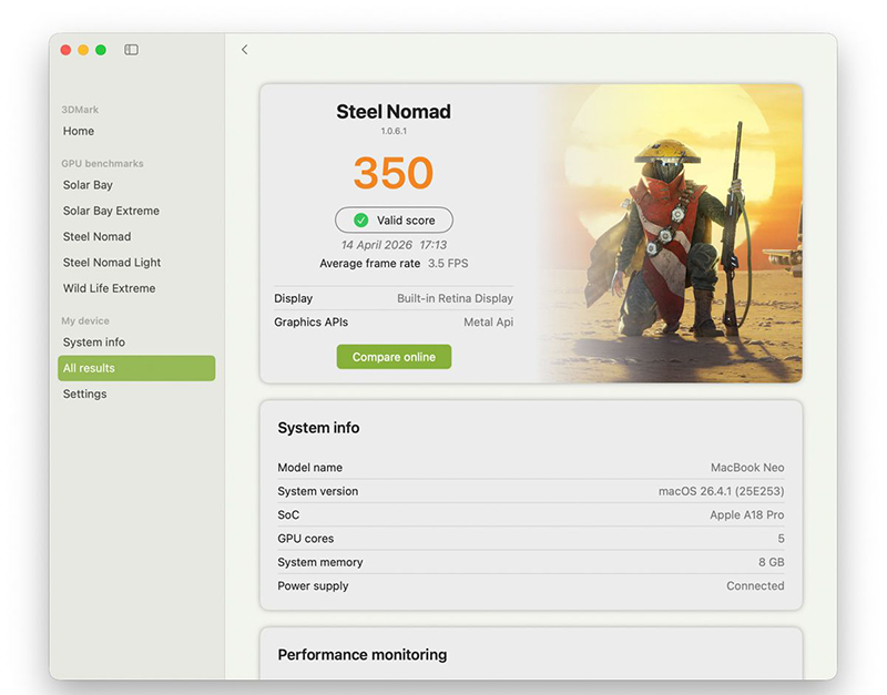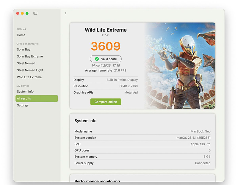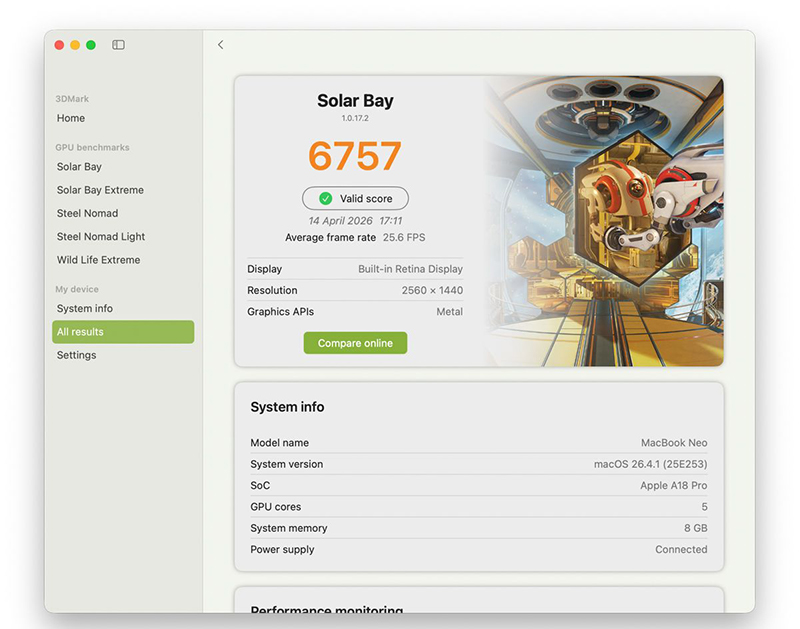 Đánh giá hiệu năng MacBook Neo về GPU thì GPU 5 nhân trên A18 Pro (ít hơn 1 nhân so với bản iPhone 16 Pro) ghi điểm đáng kể trong bài đo 3DMark: