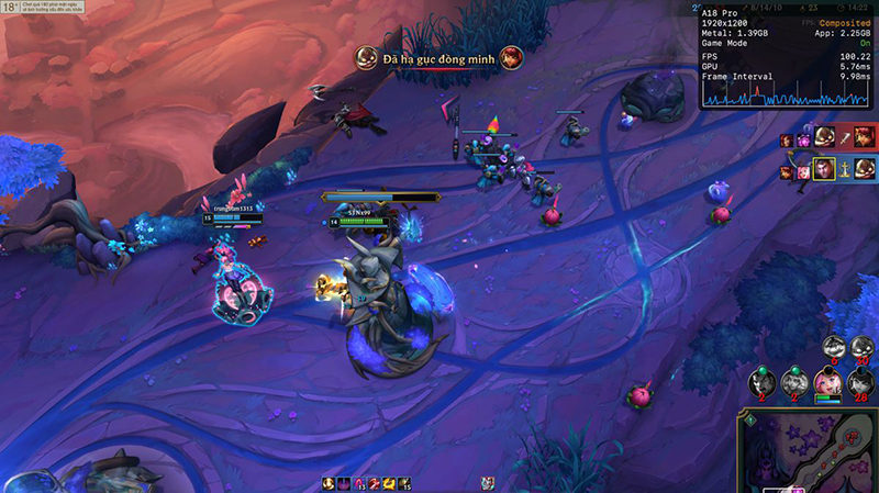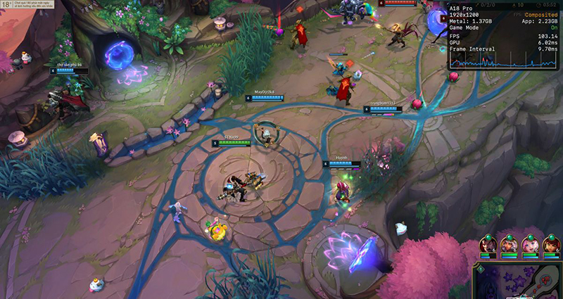 Để đánh giá hiệu năng MacBook Neo, máy được kiểm tra giới hạn chạy thử Liên Minh Huyền Thoại ở đồ họa cao nhất, độ phân giải 1920×1200. Kết quả: FPS trung bình đạt khoảng 104 khung hình/giây, ổn định ngay cả trong các pha giao tranh tổng dồn dập.