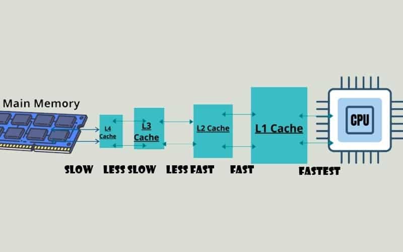 Bộ nhớ đệm cache có tốc độ chạy tương tự như CPU và thuộc vào hai cấp độ chính là L1 và L2. L1 được coi là bộ nhớ đệm gần nhất và nhanh nhất của CPU, mỗi lõi CPU sở hữu một bộ nhớ cache L1 riêng.