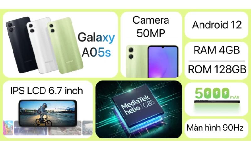 Ngoài ra, với viên pin 5000 mAh cùng công nghệ sạc nhanh 25W có thể sạc đầy pin cho thiết bị nhanh chóng giúp bạn sử dụng trong 1 ngày dài. Cụm camera kép có độ phân giải 50MP và 2MP cho phép chụp ảnh rõ nét, dễ dàng. Bên cạnh đó, Galaxy A05 cũng được trang bị con chip Mediatek Helio G85 nâng cấp hơn, giúp các trải nghiệm của bạn khi chơi game trở nên dễ dàng, mượt mà.