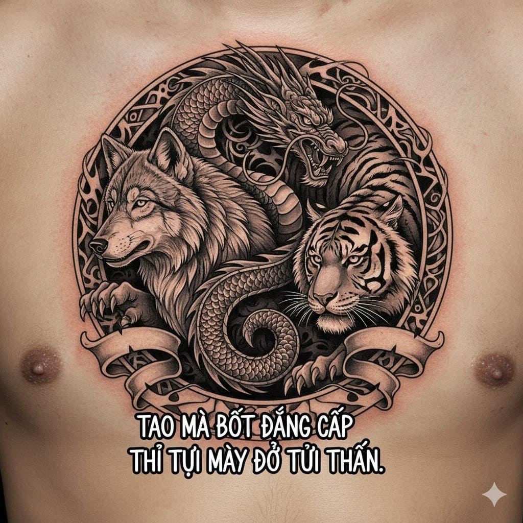 - Hình sói, rồng, hổ mang phong cách tattoo: “Tao mà bớt đẳng cấp thì tụi mày đỡ tủi thân.”