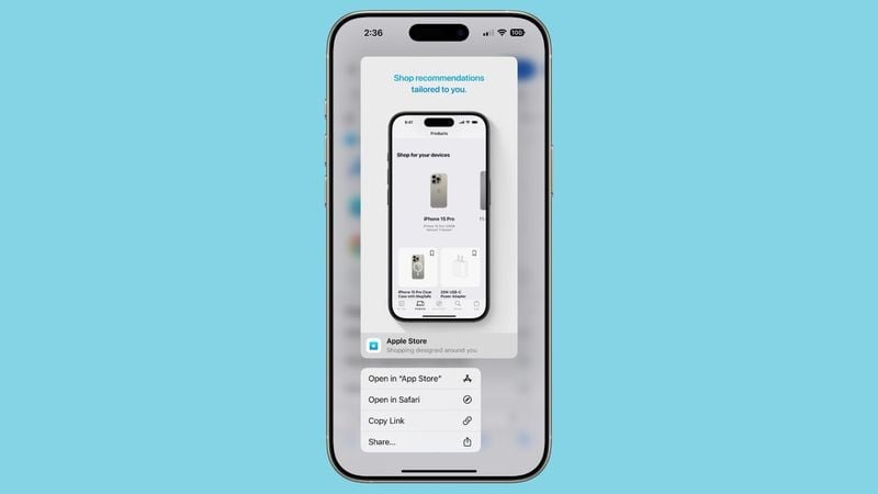 Khi nhấn giữ liên kết App Store trong Safari, bản xem trước sẽ xuất hiện với giao diện được làm mới. Ngoài ra, khi mở tab mới và chạm vào thanh địa chỉ, Safari sẽ hiển thị lịch sử tìm kiếm gần đây, với tùy chọn tắt tính năng này trong phần cài đặt Safari.