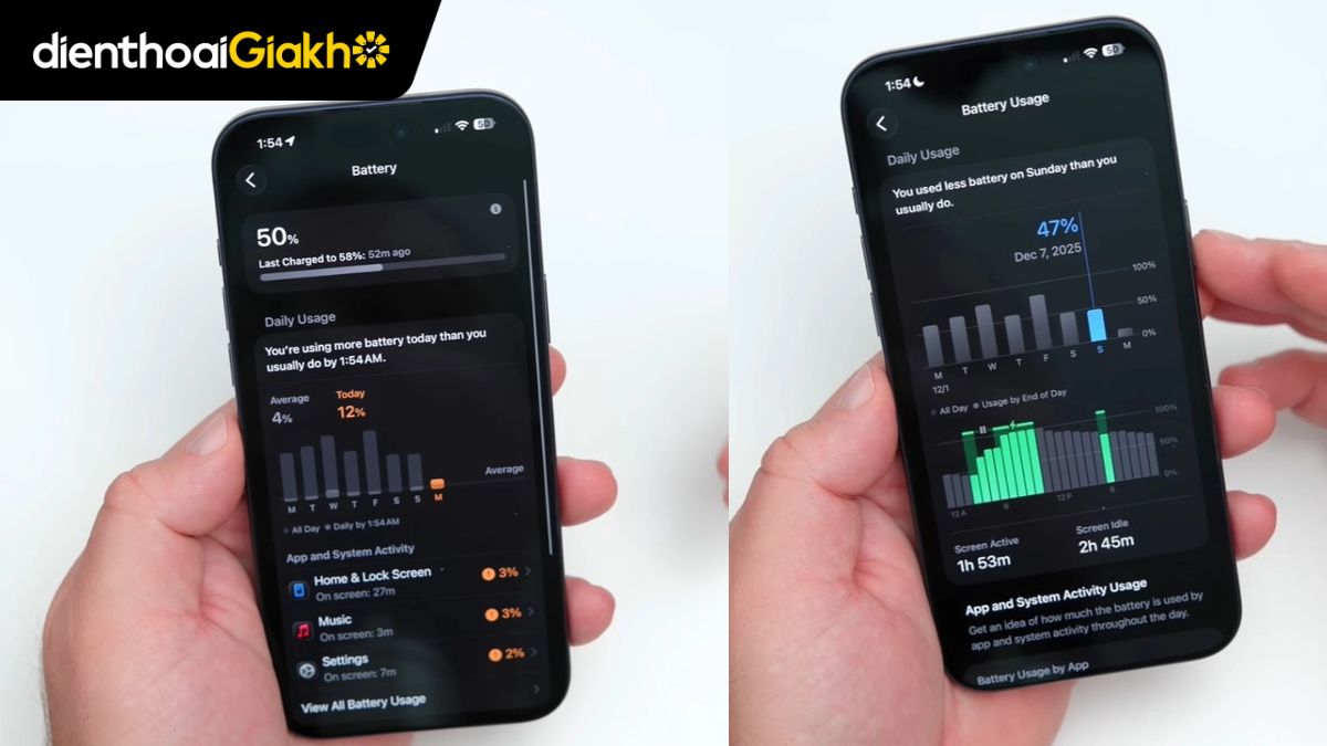 Ở góc độ sử dụng hằng ngày, iOS 26.2 không hao pin mà còn cho thời lượng pin tốt hơn rõ rệt so với iOS 26.1. Dù phần thống kê pin trong Cài đặt đôi lúc báo chưa chính xác (thời gian sử dụng hiển thị thấp hơn thực tế), nhưng trải nghiệm thực tế lại rất ấn tượng.