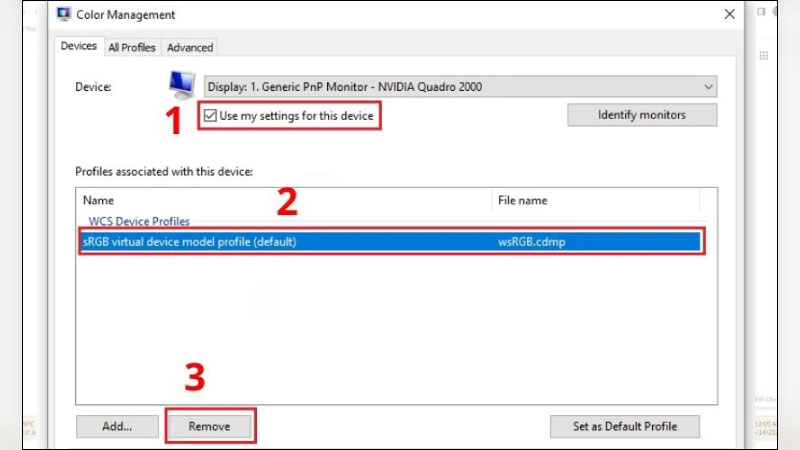 Bước 2: Lúc này một hộp thoại sẽ mở ra bạn nhấn chọn vào ô Use my settings for this device. Chọn tiếp vào Profile associated with this device và nhấn vào Remove.