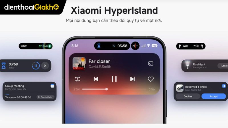 - Xiaomi HyperIsland – hiển thị hoạt động trực tiếp ở mép trên màn hình, hỗ trợ tối đa 3 “đảo” và cửa sổ nổi giúp đa nhiệm tốt hơn, tương tự Dynamic Island của Apple.