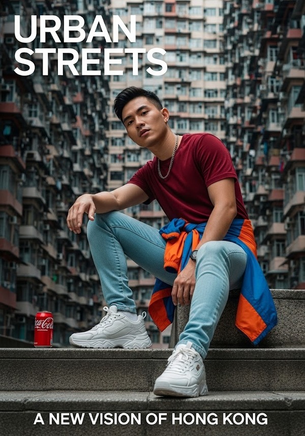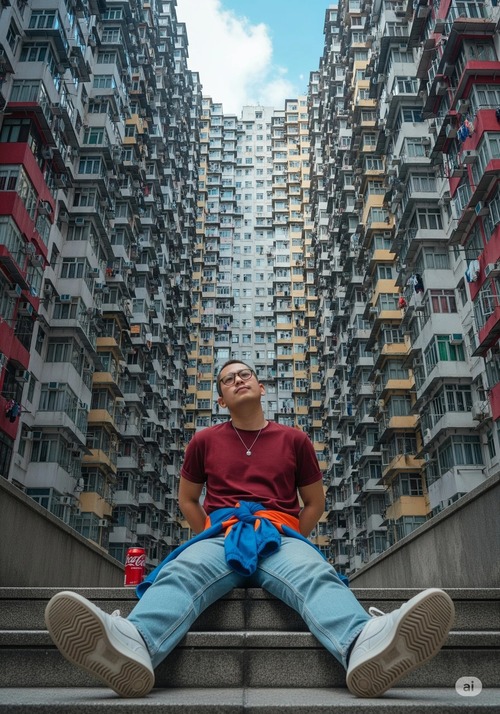 “Một bức chân dung đô thị đầy phong cách và mang tính biểu tượng, mô tả một người đàn ông châu Á trẻ tuổi tạo dáng thoải mái trên những bậc thang bê tông, phía sau là khu dân cư cao tầng dày đặc, uốn lượn giống như tòa nhà Monster/Yick Cheong ở Hong Kong.