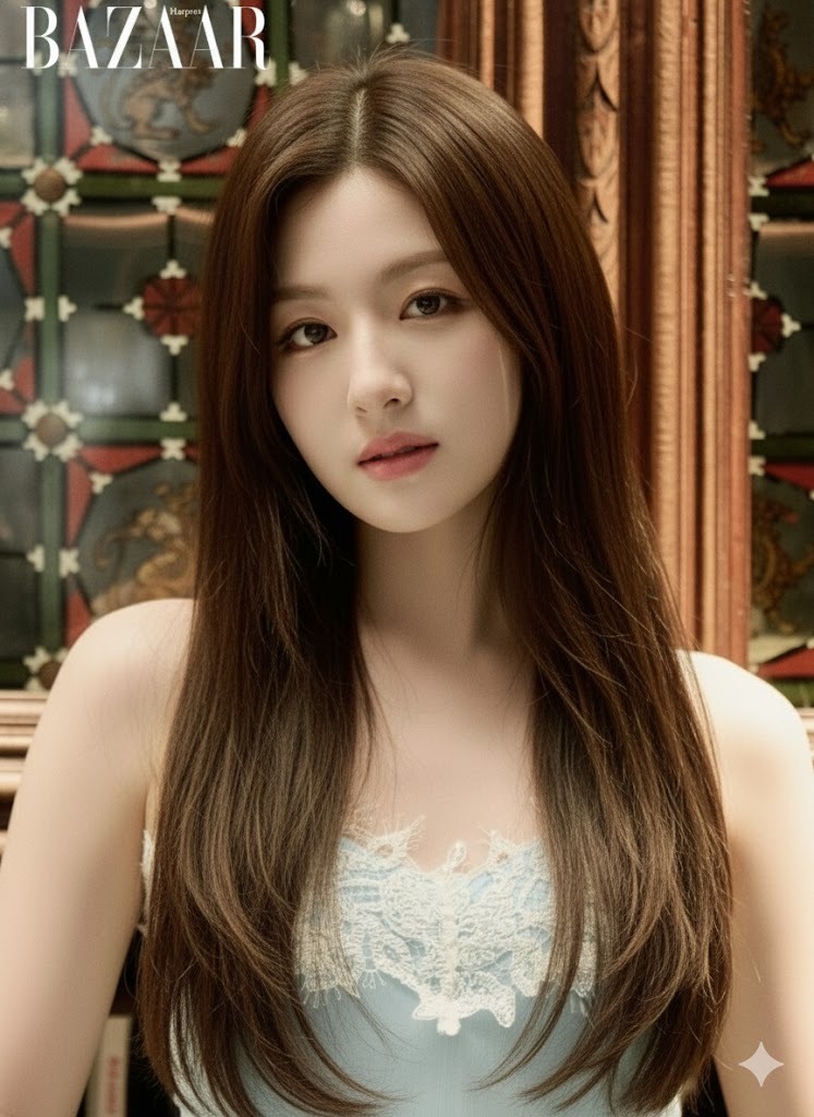 Transform the reference photo into a hyper-realistic, high-resolution studio portrait. Preserve the exact facial features. Give the subject long, pin-straight hair, parted down the middle, glossy jet-black finish.