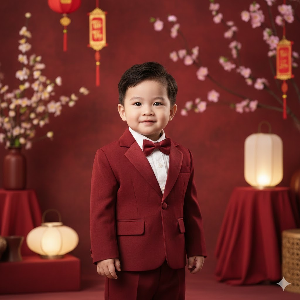 Use the image I provided, keep the same facial features. A stylish Vietnamese toddler boy wearing a modern red suit tailored for Lunar New Year. The blazer is deep red with subtle satin lapels, paired with a white shirt and small bow tie. He is standing confidently in a luxury studio Tet setup. Expression is cool yet adorable, confident small smile, natural childlike innocence.