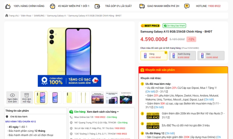 Trong khi đó, Samsung Galaxy A15 đang được bán với mức giá 4.590.000đ, là sự lựa chọn tiết kiệm hơn, nhưng vẫn sở hữu nhiều ưu điểm nổi bật như màn hình sắc nét và cấu hình ổn định.