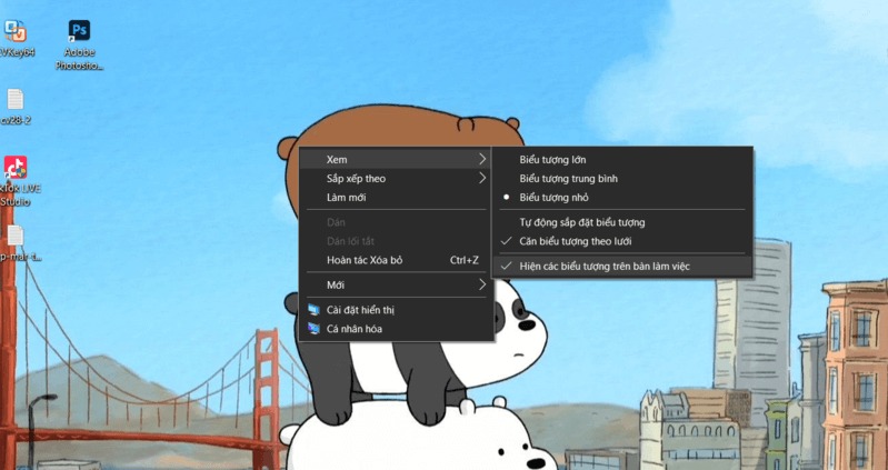 Thao tác đơn giản và nhanh chóng nhất là bật lại tính năng hiển thị trên giao diện màn hình. Để làm điều này, bạn chỉ cần chuột phải vào màn hình Desktop, chọn mục View. Nếu phần “Show desktop icons” chưa được tích chọn, hãy tích vào để hiển thị lại icon ứng dụng trên màn hình.
