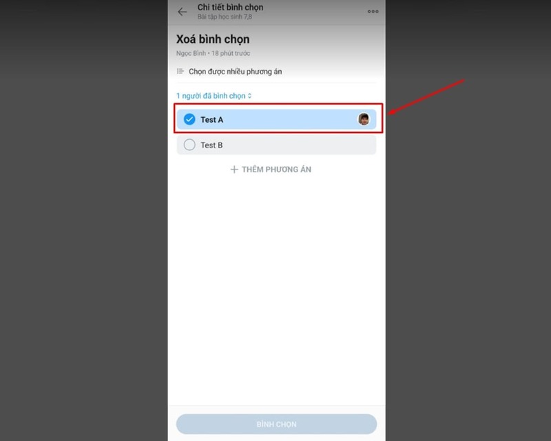 - Bước 4: Để xoá bình chọn đó, bạn chỉ cần nhấn một lần nữa vào bình chọn bạn đã chọn trước đó để loại bỏ dấu tích. Sau đó, bạn hãy nhấn BÌNH CHỌN để lưu lại thay đổi của mình.