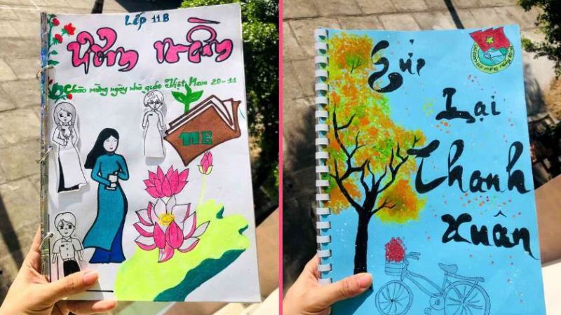 - Bước 3: Dùng giấy cứng làm bìa. Trang trí bằng vẽ tay, cắt dán, sticker hoặc thiết kế in. Họa tiết gợi nhớ về trường lớp, thầy cô.