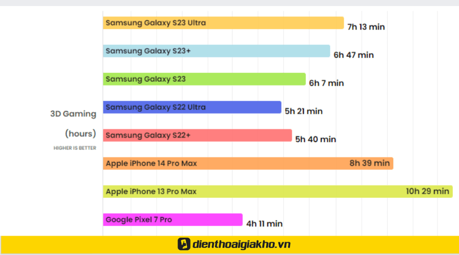 Ở bài test chơi game 3D, chúng ta có thể thấy thời lượng pin được cải thiện đáng kể cho cả dòng Galaxy S23. Cụ thể, thời lượng pin Galaxy S23 thấp nhất trong 3 version của dòng Samsung Galaxy S23 với thời lượng là 6h7p, thời lượng pin trâu nhất trong 3 là S23 Ultra.