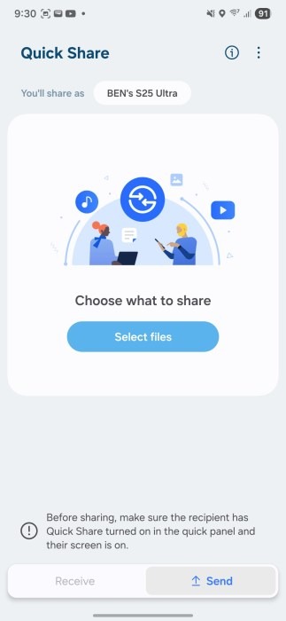 Tính năng dịch vụ chia sẻ dữ liệu Quick Share trên One UI 8 được làm mới với hai tab riêng biệt là “Gửi” và “Nhận”. Thay vì sử dụng menu chia sẻ truyền thống, người dùng có thể chọn tệp trực tiếp từ giao diện mới này, giúp thao tác trở nên đơn giản và trực quan hơn. Giao diện mới của Quick Share cũng đang được Google phát triển để triển khai trên toàn bộ thiết bị Android trong thời gian tới.