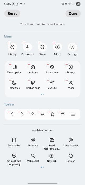 Trình duyệt Samsung Internet được cập nhật thiết kế lại menu phím tắt tràn, cho phép người dùng dễ dàng tùy chỉnh theo sở thích và sử dụng nhanh những tính năng thường dùng như chia sẻ, đánh dấu trang hay chế độ ẩn danh.