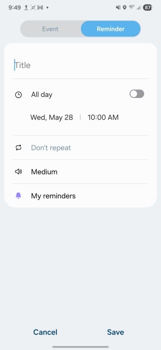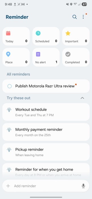 Ứng dụng Reminder được thiết kế lại với giao diện dễ theo dõi, hiển thị các danh mục lời nhắc ngay phía trên cùng. Samsung cũng bổ sung các mẫu lời nhắc và gợi ý thông minh, giúp người dùng tạo nhắc nhở nhanh chóng. Song song đó, ứng dụng Lịch cũng tích hợp tính năng One UI 8 với khả năng tạo và quản lý nhắc nhở ngay trong giao diện lịch, giúp đồng bộ hóa mọi hoạt động cá nhân.