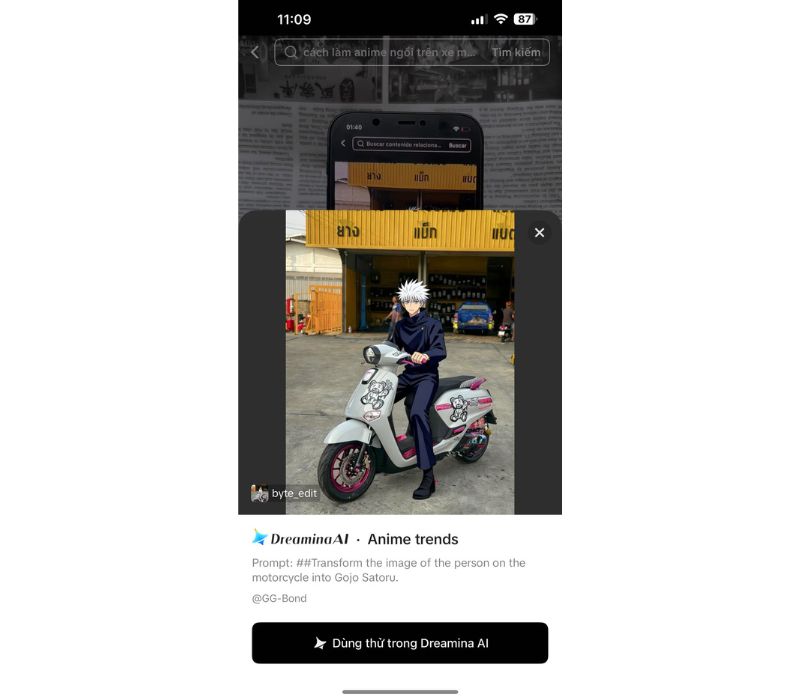 Bước 1: Mở TikTok và vào một video đang theo trend Anime ngồi trên xe máy. Trong video hoặc phần mô tả sẽ có link mẫu được gắn sẵn, bạn nhấn vào link này để bắt đầu.