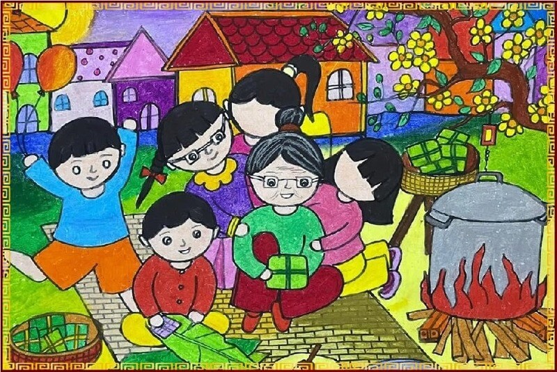 Những bức tranh có thể mô tả cảnh mọi người cùng nhau chuẩn bị mâm cỗ, những phiên chợ quê nhộn nhịp, hay hình ảnh trẻ em vui chơi. Qua đó, bạn sẽ không chỉ thể hiện được vẻ đẹp của quê hương mà còn ghi lại những kỷ niệm đáng nhớ của ngày Tết.